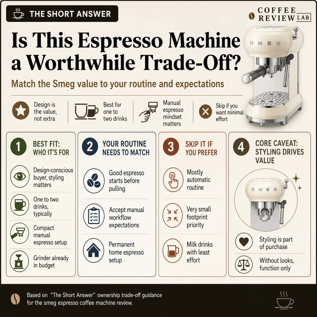 If most of those are yes, the Smeg belongs on the shortlist. If two or fewer are yes, a simpler espresso machine fits the job better.